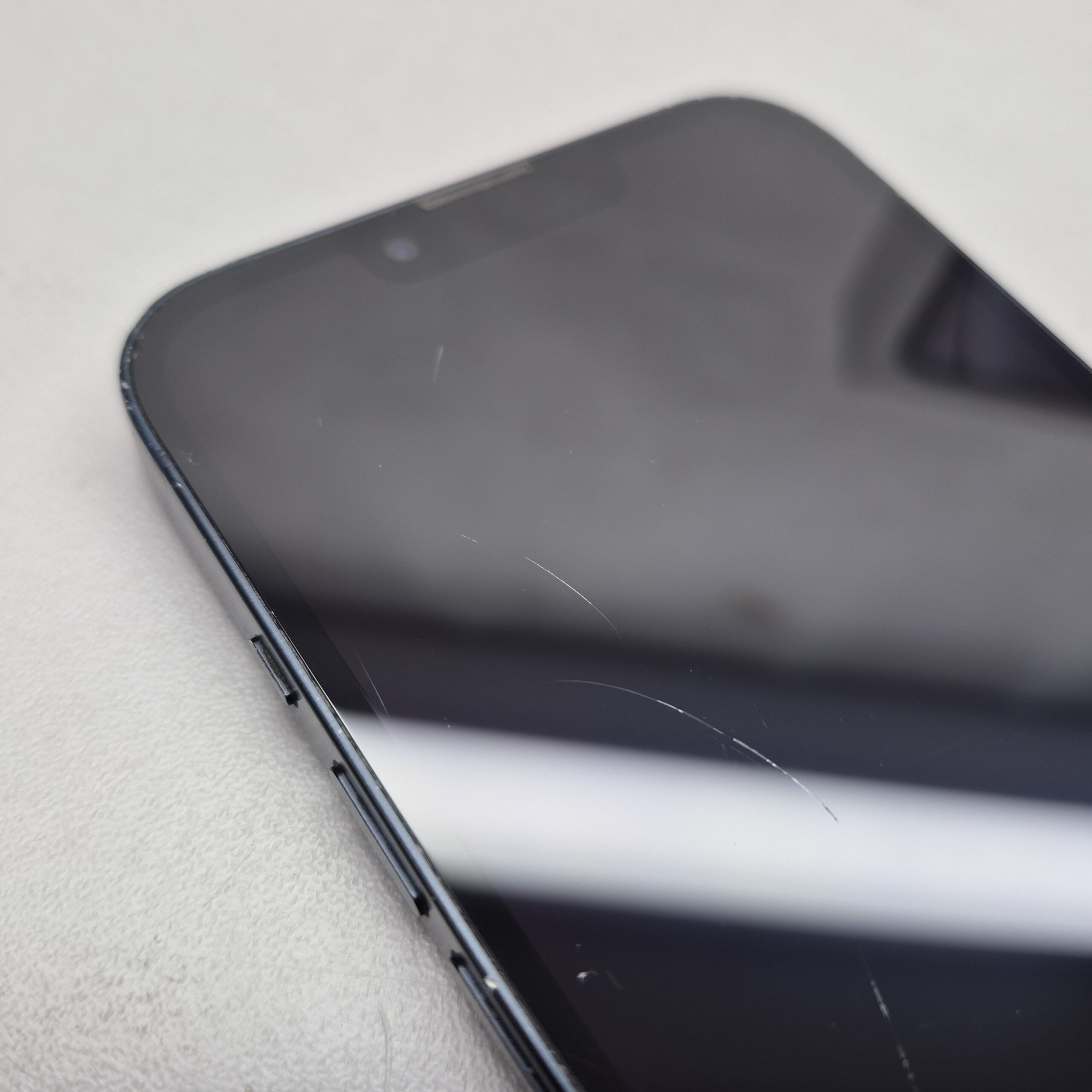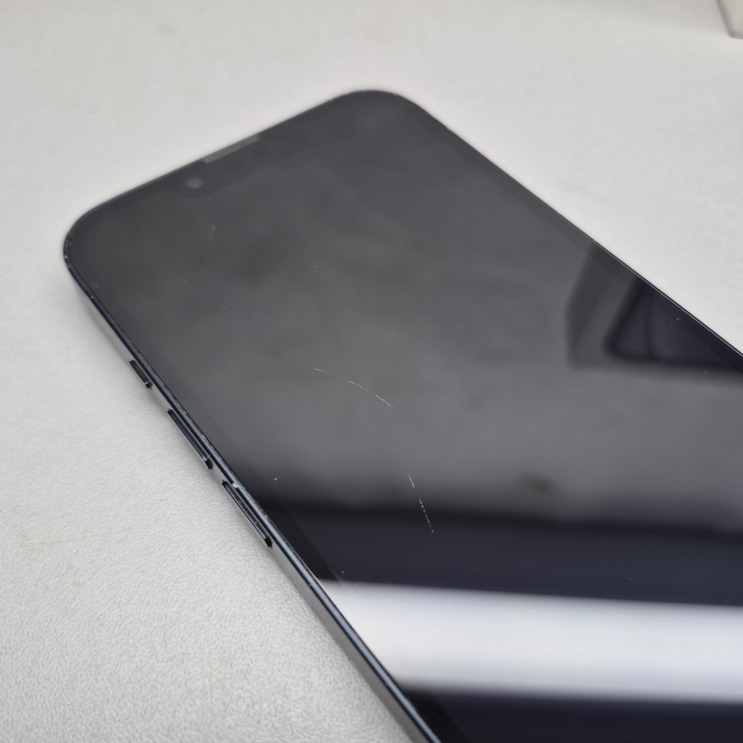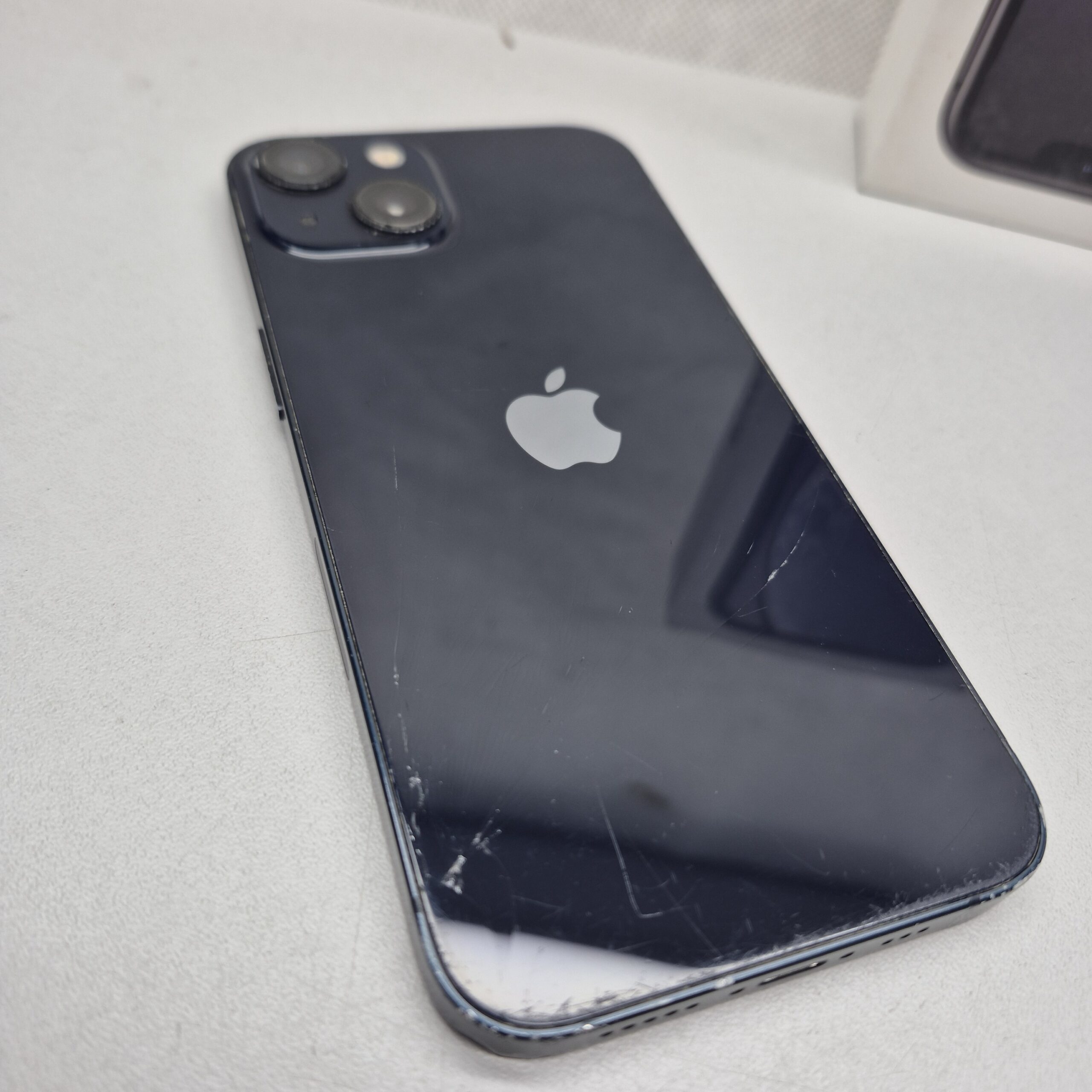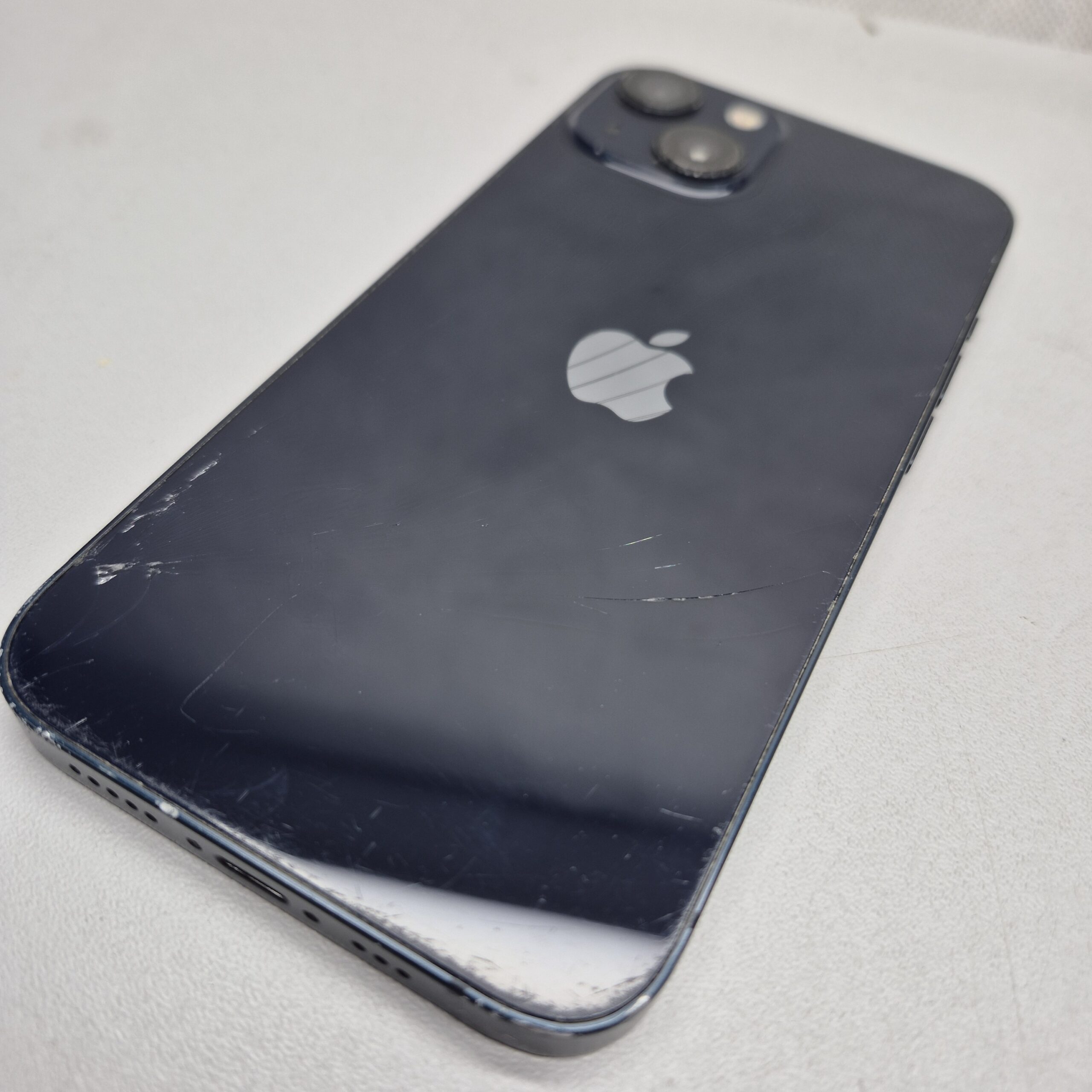 Używany iPhone 13 z wbudowaną pamięcią 128GB. Sprawny. Rozbite plecy, ekran porysowany, obudowa obtarta, wgniotki.