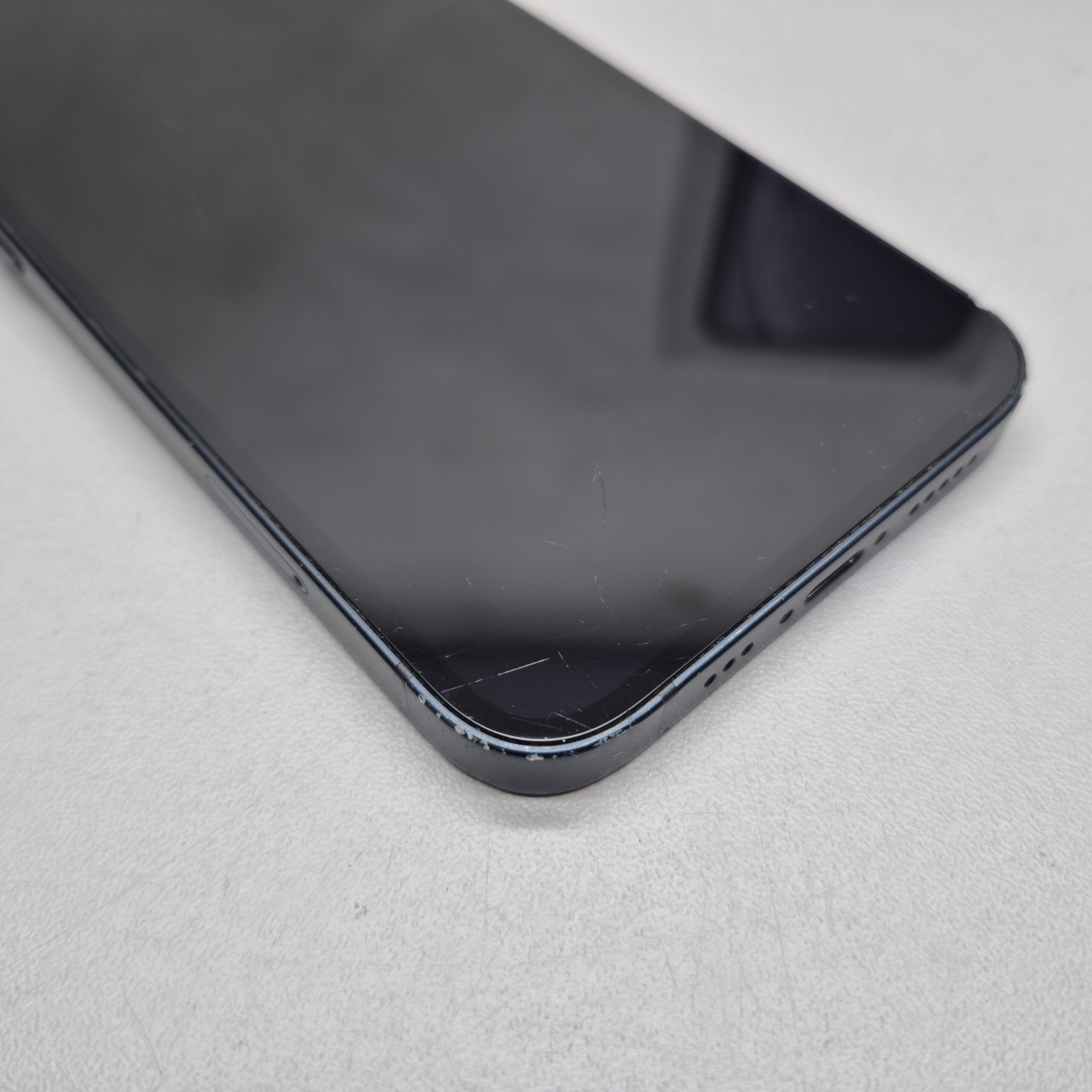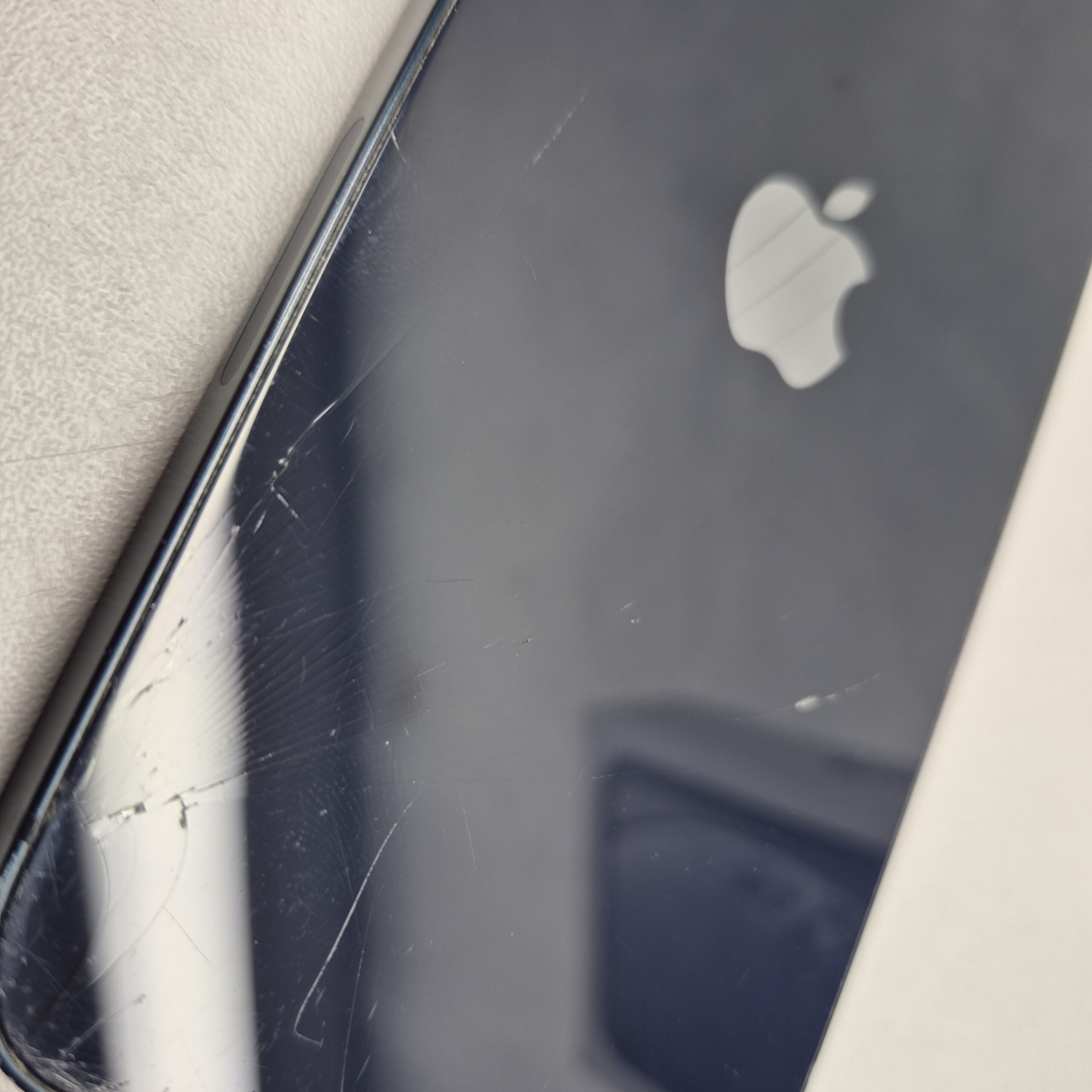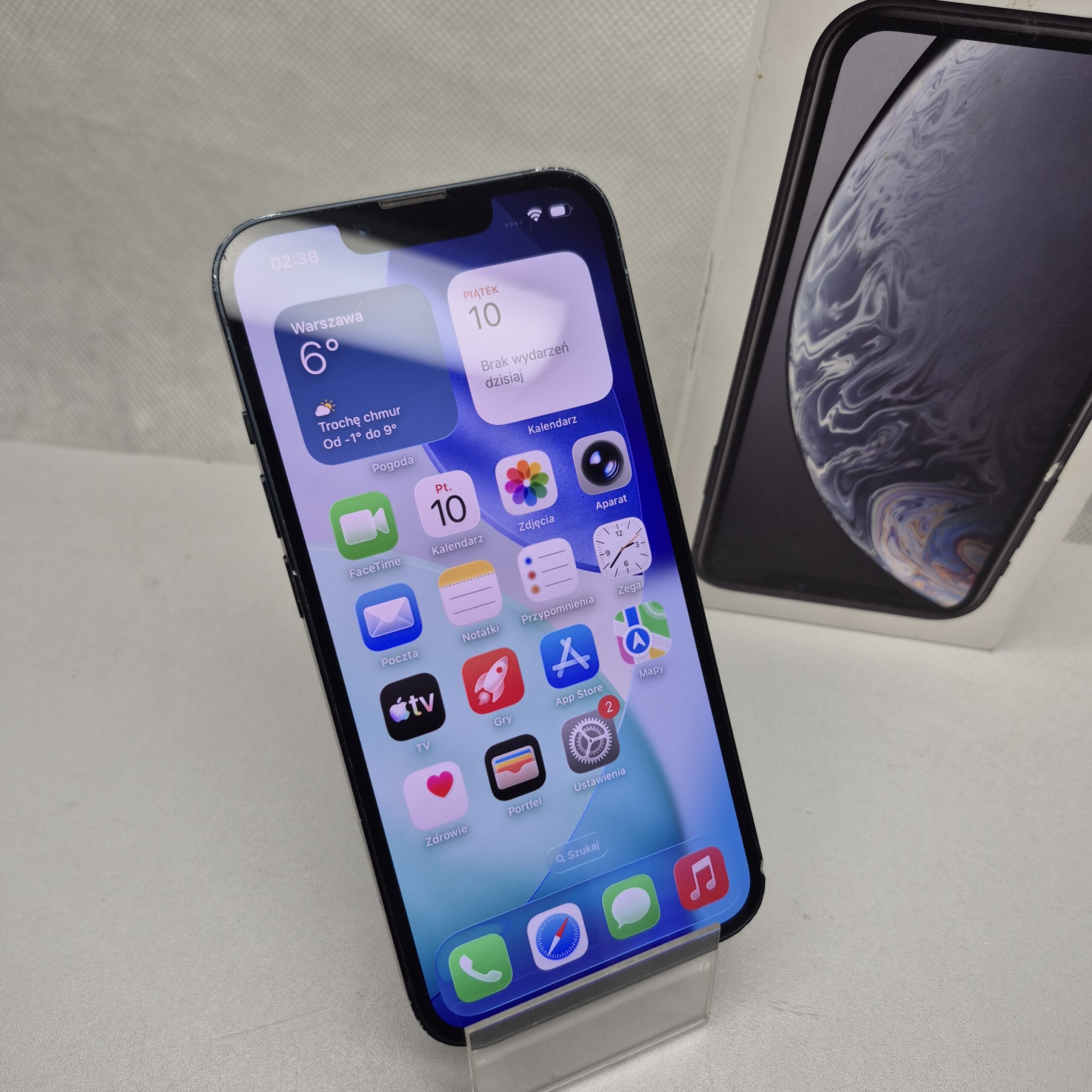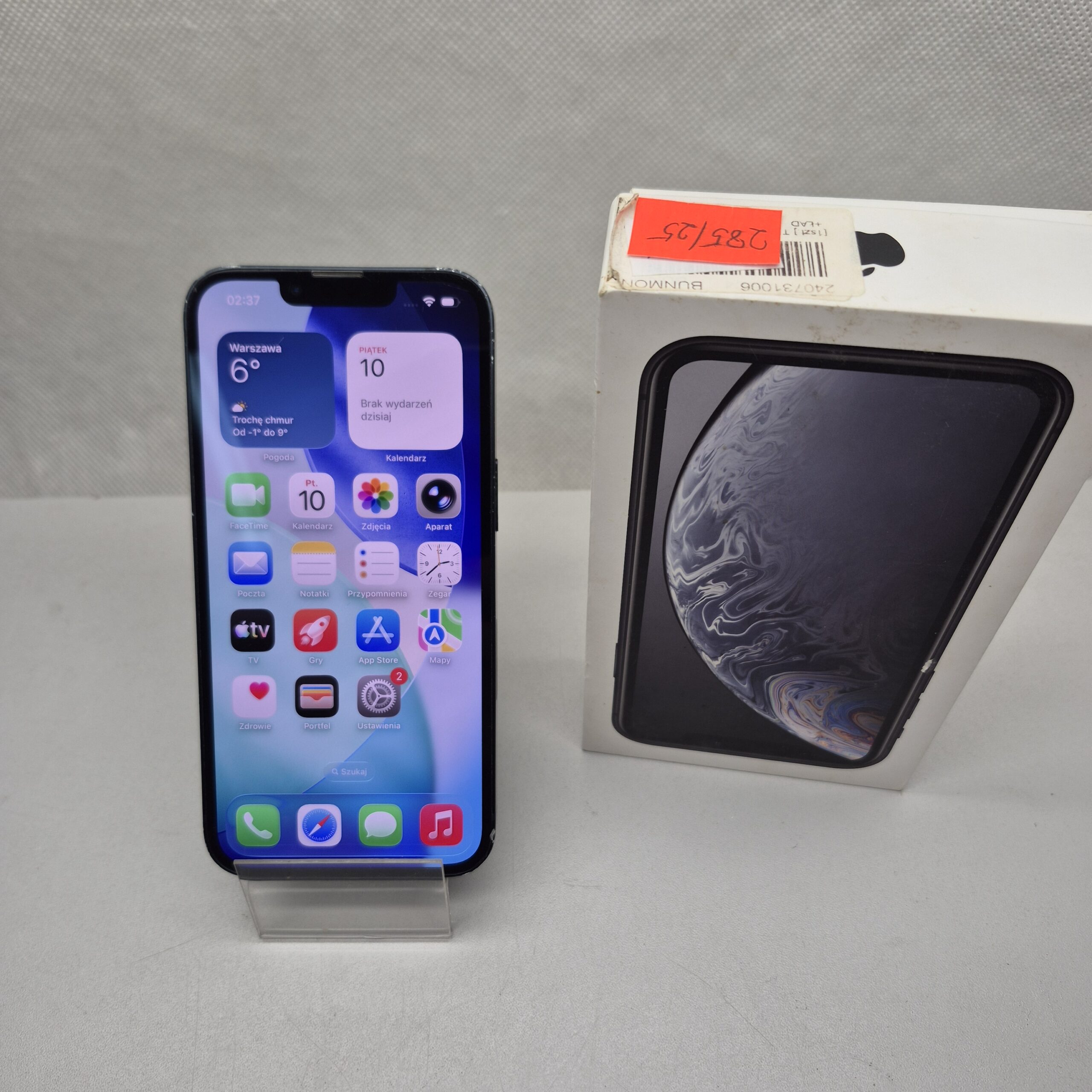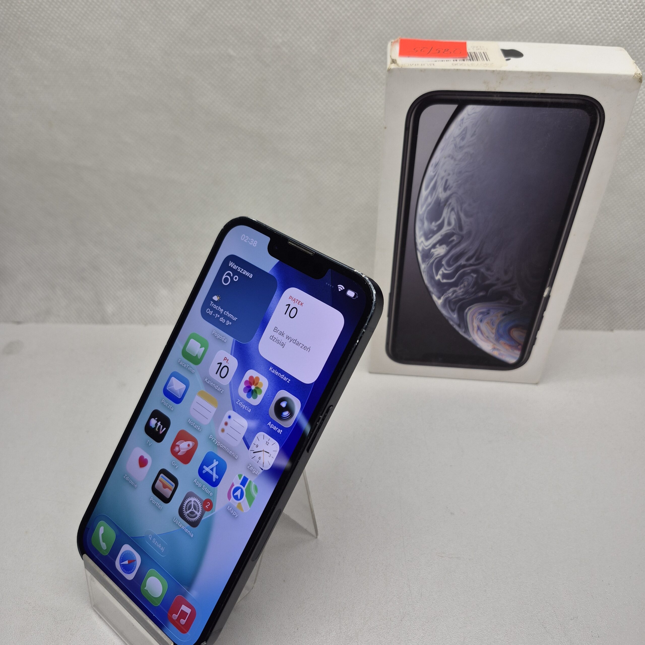 Używany iPhone 13 z wbudowaną pamięcią 128GB. Sprawny. Rozbite plecy, ekran porysowany, obudowa obtarta, wgniotki.