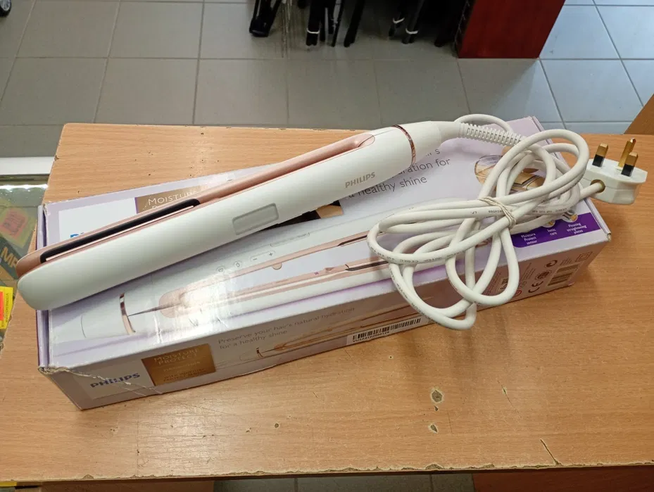 Zadbana prostownica Philips Moisture Protect, używana i sprawna. Posiada angielską wtyczkę, działa bez problemu na 220/240V z przejściówką (brak w zestawie)